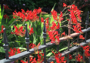 Crocosmia ‘Lucifer’ in full bloom along a fence in July.
